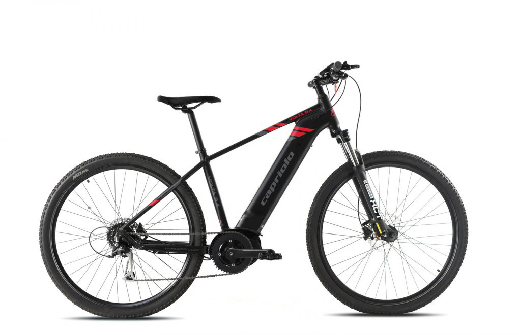 CAPRIOLO E-BIKE bicycle MODEL VOLTA 9.4, with 650 watts and 80 newtons, 29" mountain wheel mounted with Shimano ALIVIO 9V 6061 aluminum frame, Sountur suspension with locking and unlocking and adjustable preload.